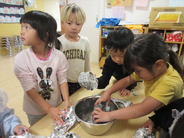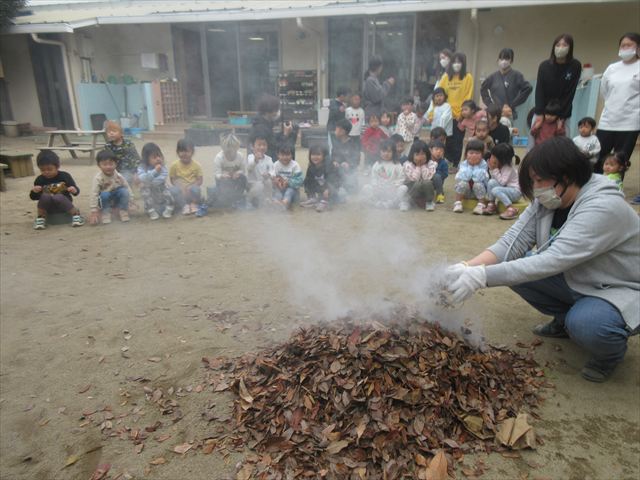 みんなで誕生児をお祝いした後に、年長児が芋掘りでとってきてくれた芋を使い焼き芋をしました。