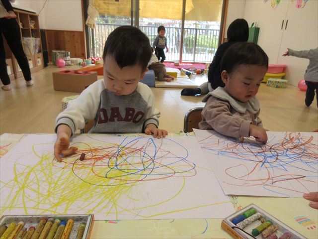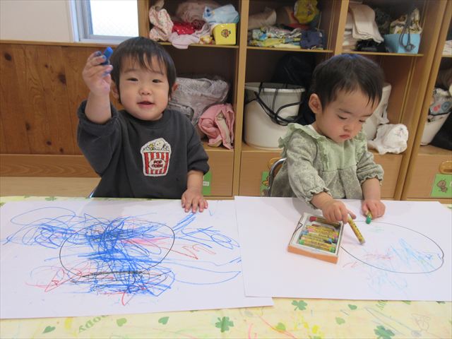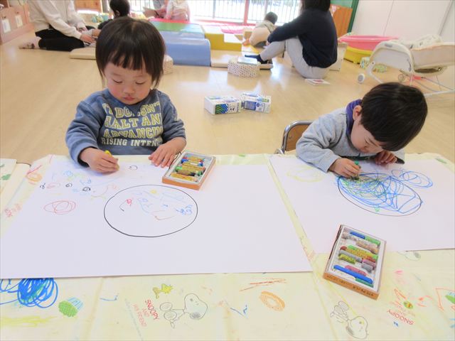 真ん中に丸を描いた画用紙でお絵描きをしました。丸の中をぬったり、たくさの丸を描いたりとそれぞれ夢中で描いていた子どもたちでした。